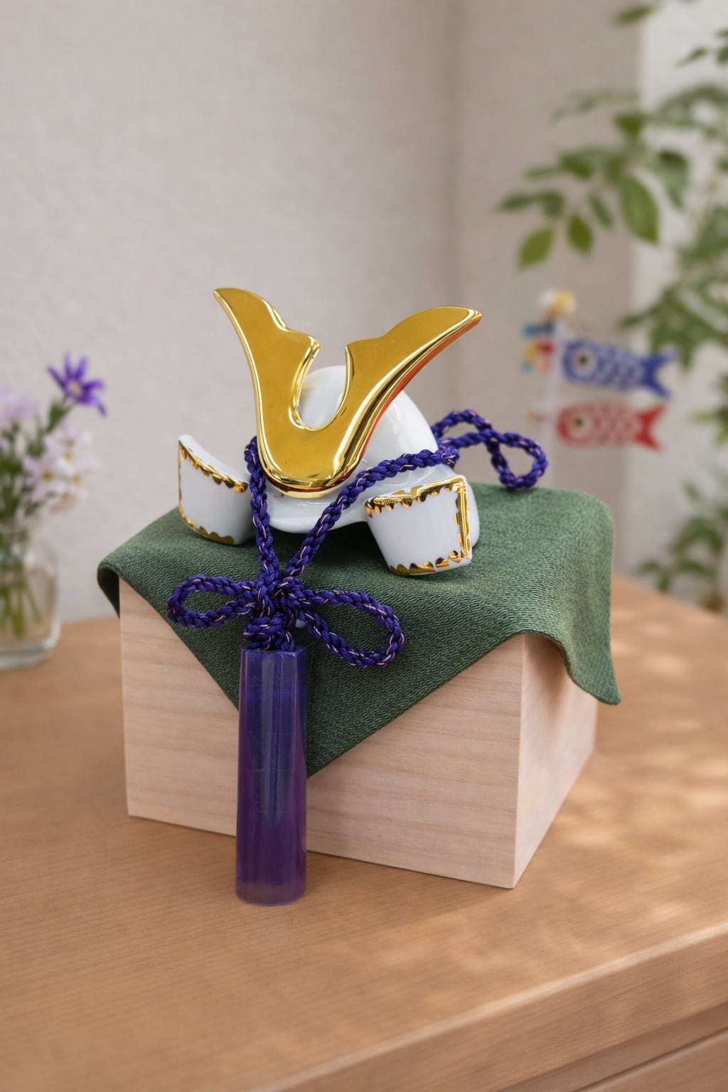 かぶと飾り小の作品を桐箱の上に飾っていただくことができます。